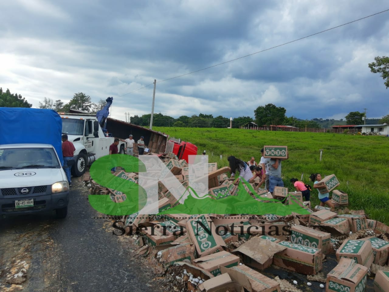 Camión cargado con varias toneladas de huevo, vuelca sobre la carretera Pachuca, Tuxpan – Sierra ...